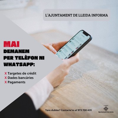 L’Ajuntament de Lleida recorda a la ciutadania que MAI demana per telèfon ni WhatsApp els números de targetes de crèdit o dades bancàries