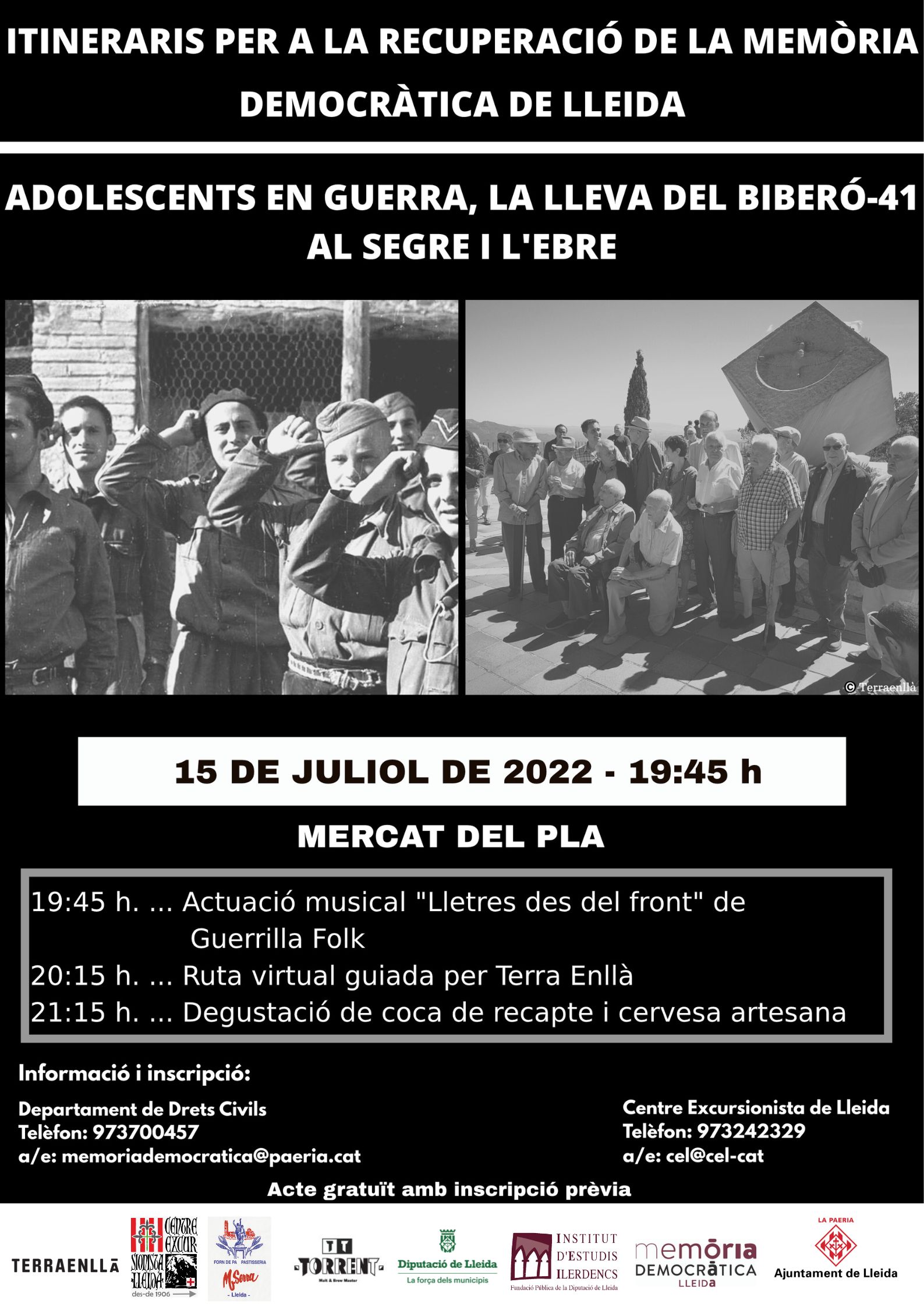 El Ayuntamiento de Lleida organiza a través del área de Memoria Democrática y con la colaboración del Centro Excursionista de Lleida, un nuevo Itinerario para la Recuperación de la Memoria Democrática. El Departamento de Derechos Civiles ha preparado el itinerario "Adolescentes en guerra, la quinta del biberón-41 en el Segre y el Ebro" guiado por Terra Enllà.