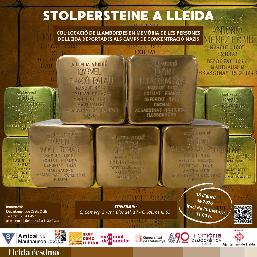 • El 20 de abril de 2019, Lleida recibió la visita del artista alemán Gunter Demnig, creador del proyecto Stolpersteine, que colocó el primer adoquín de memoria en la ciudad. Estas piedras —o “piedras para tropezar”— rinde homenaje a las personas deportadas a los campos nazis y se instalan ante el último domicilio conocido de cada víctima, invitando a los peatones a detenerse y recordarlas.