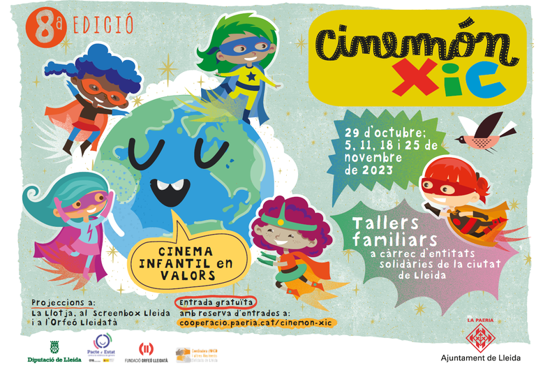 - Vuelve la 8ª edición de Cinemón Xic 2023, un espacio de reflexión familiar en valores, promoviendo la Educación para la Transformación Social a través del cine infantil en catalán. El ciclo se organiza desde la Concejalía de Cooperación del Ayuntamiento de Lleida. Acompañanos en un viaje por el mundo de la mano de heroínas valientes. Un recorrido en clave de género, con niñas y mujeres como protagonistas, defensoras de sus derechos y los derechos de las personas que las rodean. Os invitamos a pasar un buen rato aprovechando la ocasión para trabajar por un mundo más justo y solidario. La reserva de entradas se abre semanalmente cada lunes a las 10h de la mañana, a través de la web de Cinemón Xic! Toda la información y reserva de entradas en https://cooperació.paeria.cat/cinemon-xic