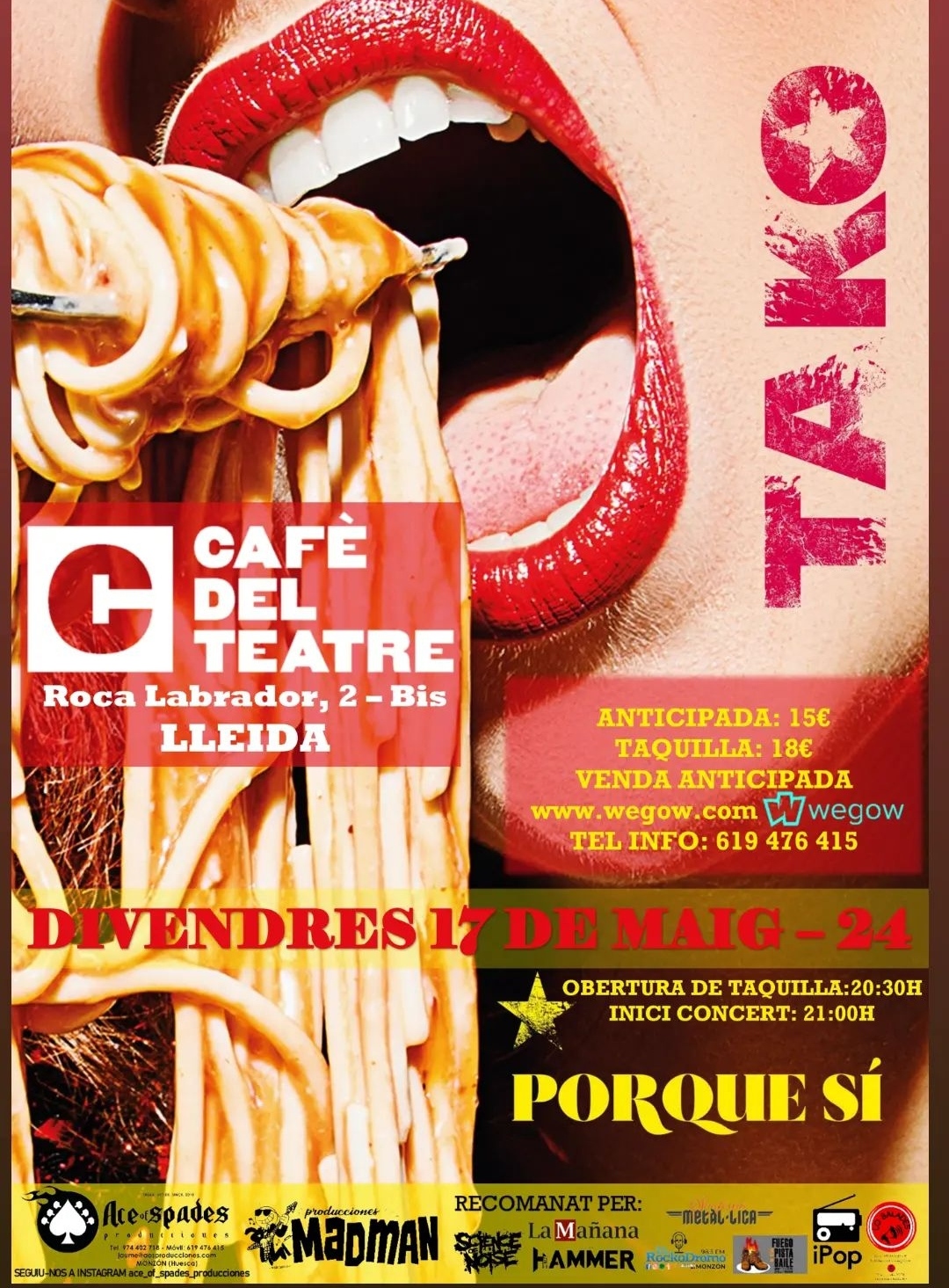 El grupo zaragozano Tako presentará los temas de su nuevo álbum «Porque Si» Su estilo se basa en un rock de contenido poético y social que se acerca al rock urbano. Es uno de los grupos aragoneses más prolíficos de todos los tiempos y máximos exponentes, junto a Héroes del Silencio, del rock aragonés.