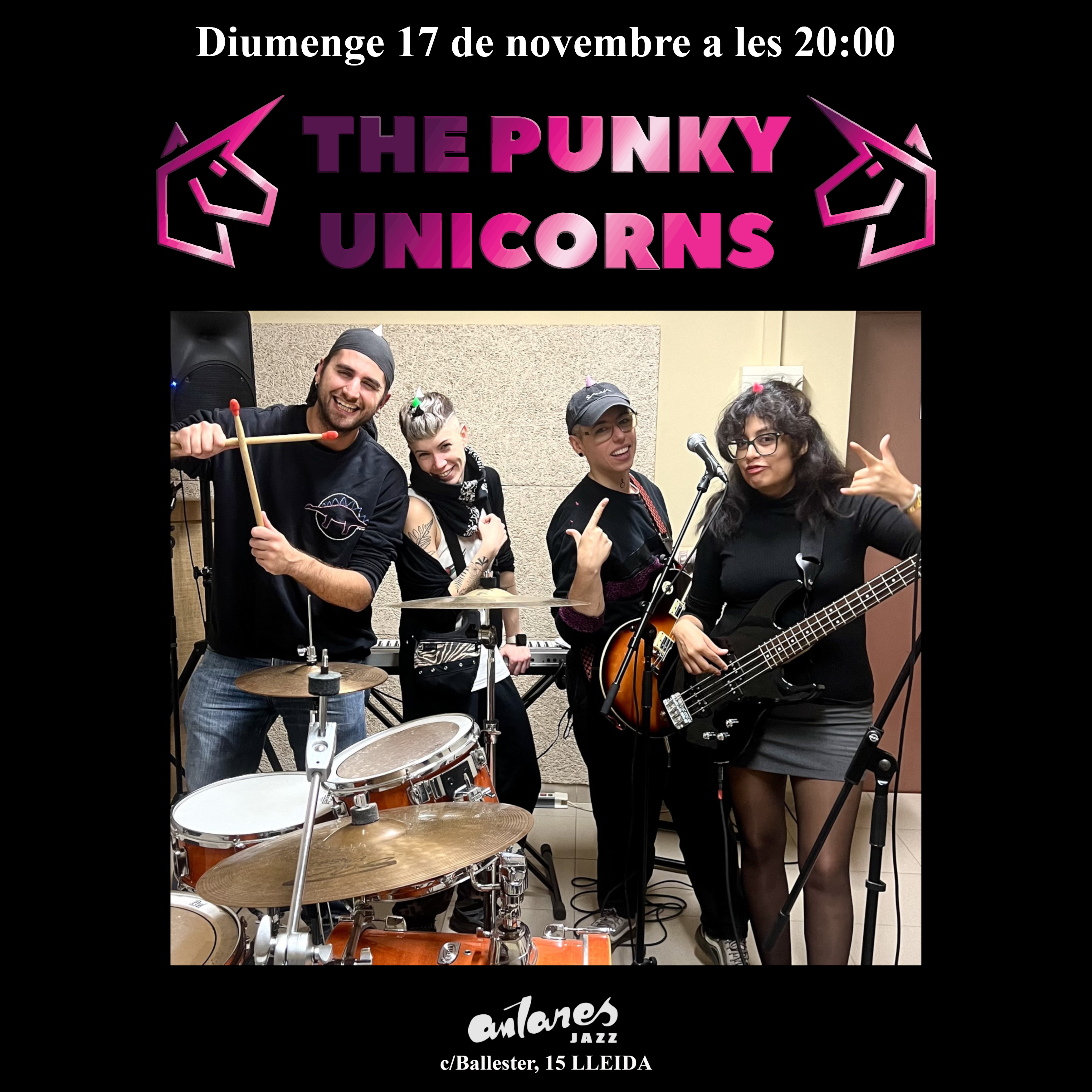 The Punky Unicorns es un proyecto musical totalmente autoproducido y autogestionado. Un grupo artístico desarticulado, de dónde entran y salen integrantes cuando quieren (y pueden). Un colectivo de animales mitológicos antimachistas que le harán mover la cresta con canciones que desafían al sistema capitalista y patriarcal, esta vez a cargo de Nathalia (bajista, vocalista y “chica de los rotuladores”), Xavi (batería y velociraptor de las baquetas), Dani (teclista, estilista, activista y reina de la pista) y de Eli (vocalista, guitarra y creador de esta ida de olla). Le invitamos a venir a nuestro ensayo con público disfrazado ya sacar de casa sus pollos de goma para emprender con nosotros este viaje más allá del arco iris, abriendo camino hacia la deconstrucción en nuestro mundo inventado “Genderful”.
