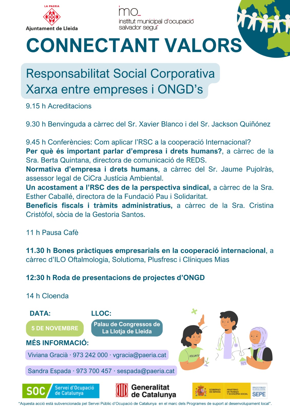 - IMO Lleida y Concejalía de Cooperación ofrecen una jornada sobre la RSC entre ONGD y empresas. La finalidad de la jornada es que las empresas de Lleida conozcan los proyectos de cooperación internacional de las ONGD de la ciudad y puedan encontrar vínculos de colaboración. ¿Quiere saber qué es la RSC? ¿Cómo aplicarla? ¿Qué ejemplos tenemos en Lleida? Fecha y hora: 5 de noviembre, de 10:00h a 14:00h Lugar: Teatre de la Llotja de Lleida (Avda. de Tortosa, 6)