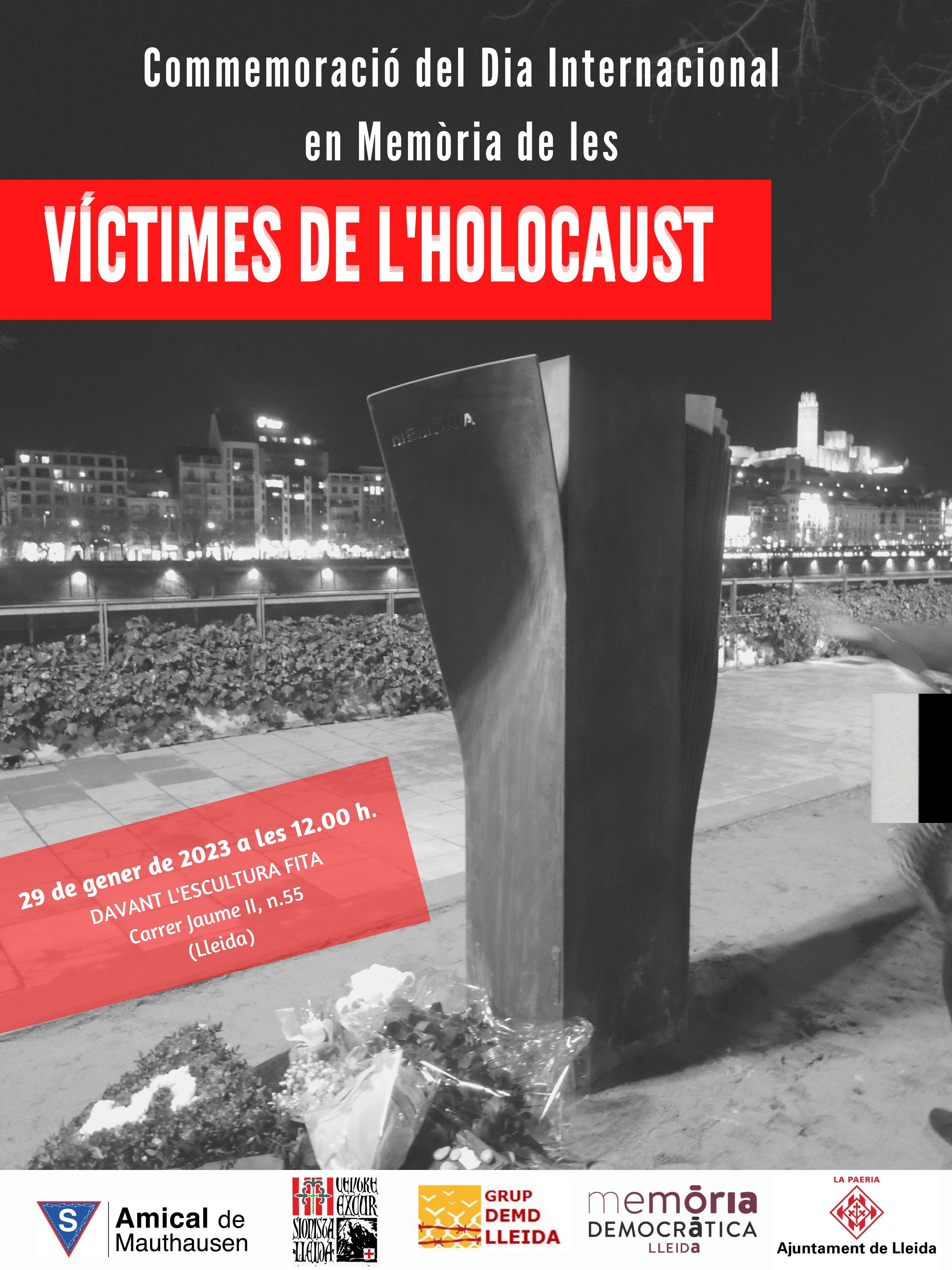 - Un año más, el Ayuntamiento de Lleida conmemora el Día Internacional en Memoria de las Víctimas del Holocausto y prevención de crímenes contra la Humanidad. Este año 2023, la conmemoración gira en torno al lema Gente corriente. La gente corriente fueron los ejecutores que llevaron a cabo el asesinato metódico, industrialmente planificado, de millones de mujeres y hombres, también gente corriente las víctimas que el nacionalsocialismo quería excluir de la sociedad al ser considerados peligrosos por su diversidad: judíos , opositores, discapacitados, masones, gitanos, homosexuales, Testimonios de Jehová.