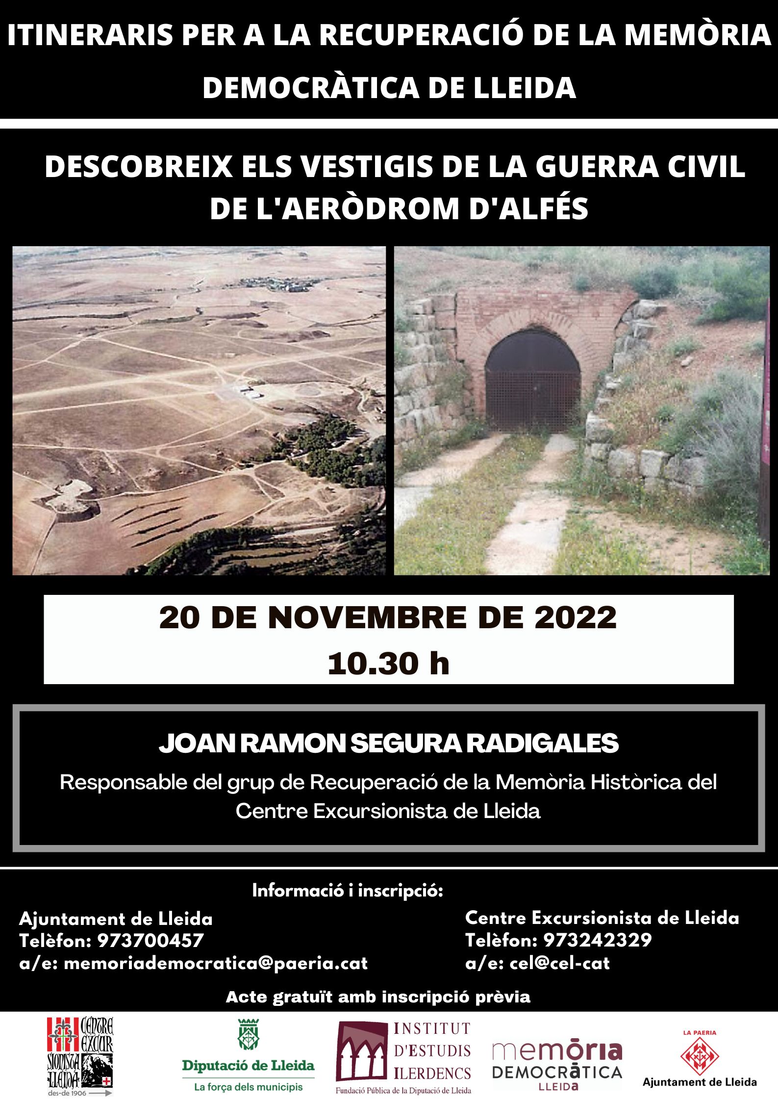 El Ayuntamiento de Lleida organiza un nuevo itinerario para la Recuperación de la Memoria Democrática: "Descubre los vestigios de la Guerra Civil del aeródromo de Alfés". El acto está organizado por el Ayuntamiento de Lleida, a través del área de Memoria Democrática y cuenta con la colaboración del Centro Excursionista de Lleida.