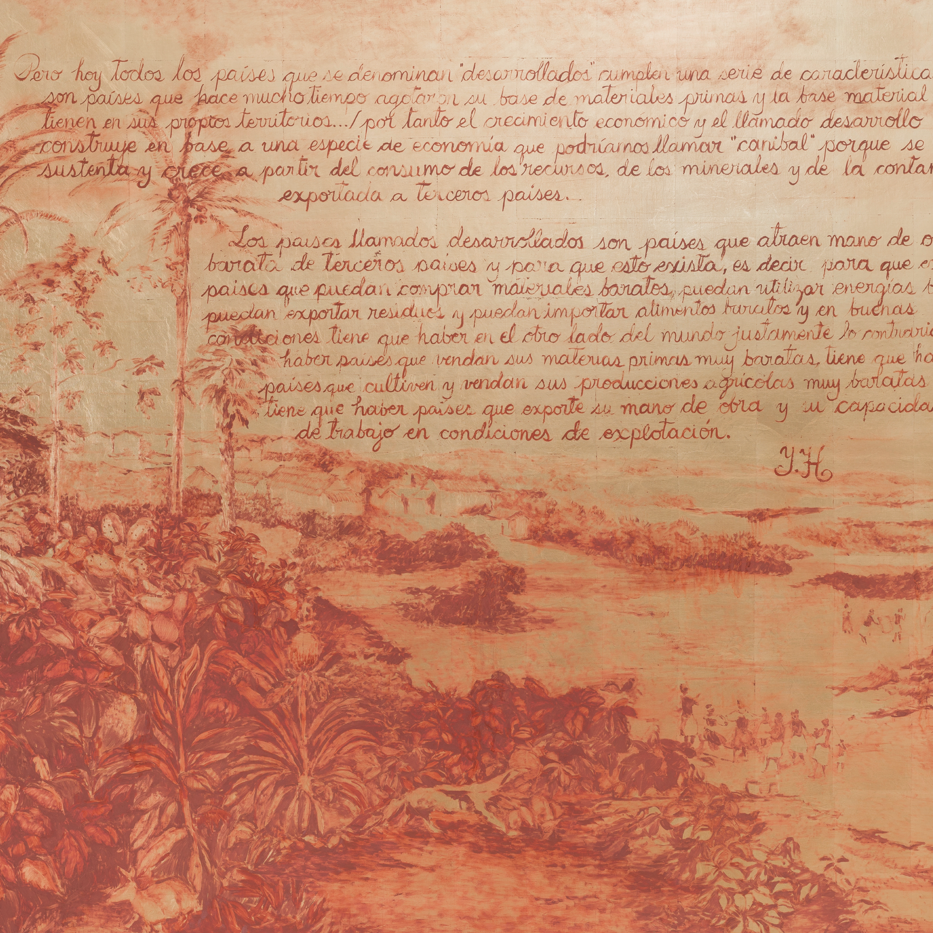 Los proyectos que forman parte de la Bienal demuestran que el extractivismo contemporáneo no se alimenta solo de recursos naturales, sino también de recursos sociales, culturales y digitales. Incidiendo en la historia colonial de España con el norte de África y Latinoamérica, los trabajos ponen de manifiesto el vínculo entre el extractivismo, el colonialismo y la degradación medioambiental; nos advierten de las trampas del marketing verde; hablan de la función extractiva del turismo de masas, la gentrificación urbana, y las tecnologías de la información y la comunicación; cuestionan la función biopolítica de la pintura de paisaje y del monumento escultórico; hablan de la capacidad de resistencia de las comunidades locales; muestran la función reparadora de rituales ancestrales basados en el respeto y en la interdependencia con la naturaleza; llevan a cabo acciones de sanación desde la cultura popular, la espiritualidad y la feminización de las luchas.