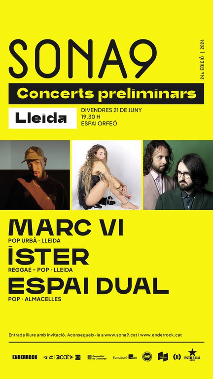 El Espai Orfeó acogerá uno de los conciertos preliminares el viernes 21 de junio a las 19:30 h con los artistas ESPAI DUAL (pop-rock – Almacelles), ÍSTER (reggae-pop – Lleida) y MARC VI (pop urbano – Lleida). El Sona9 está organizado por la plataforma TresCat y la revista Enderrock con el patrocinio de Estrella Damm. Con el pop de autor, la música urbana y el pop-rock como máximos exponentes de la nueva escena catalana, Sona9 apuesta por la regeneración de la riqueza musical del país.