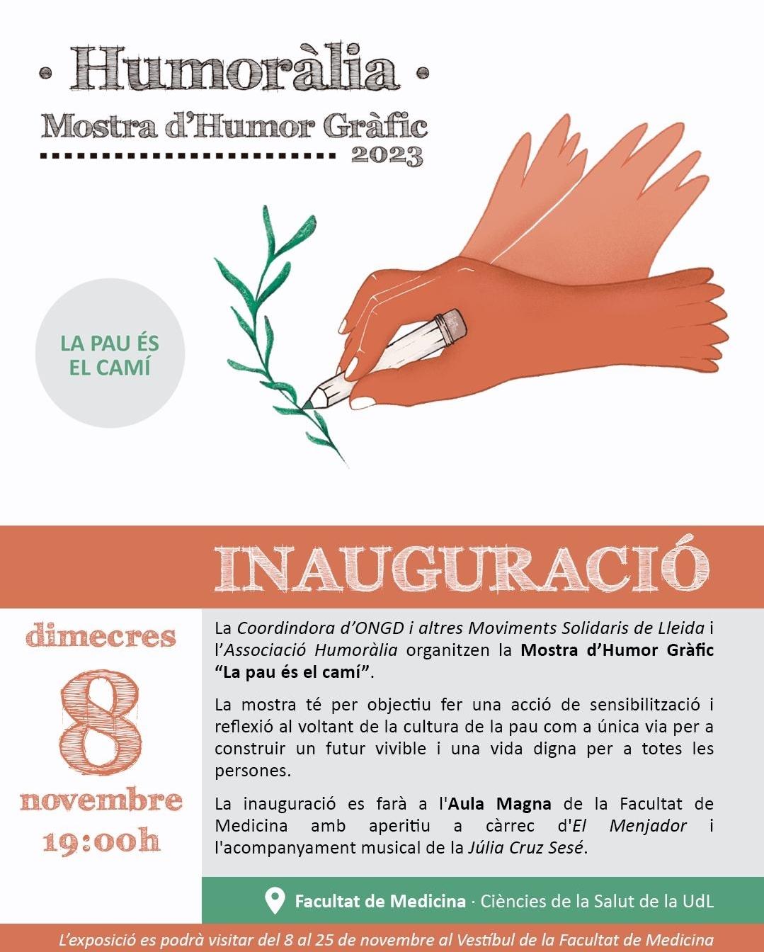 INAUGURACIÓN de la 7a muestra de humor gráfico, miércoles 8 de noviembre a las 19h en el Aula Magna de la Facultad de Medicina. La Coordinadora de ONGD y la asociación Humoralia organizan la muestra bajo el título "La paz es el camino". El acto estará acompañado por la música de Julia Cruz Sesé y el aperitivo a cargo de El Comedor. La exposición podrá visitarse del 8 al 25 de noviembre en el Vestíbulo de la Facultad de Medicina.