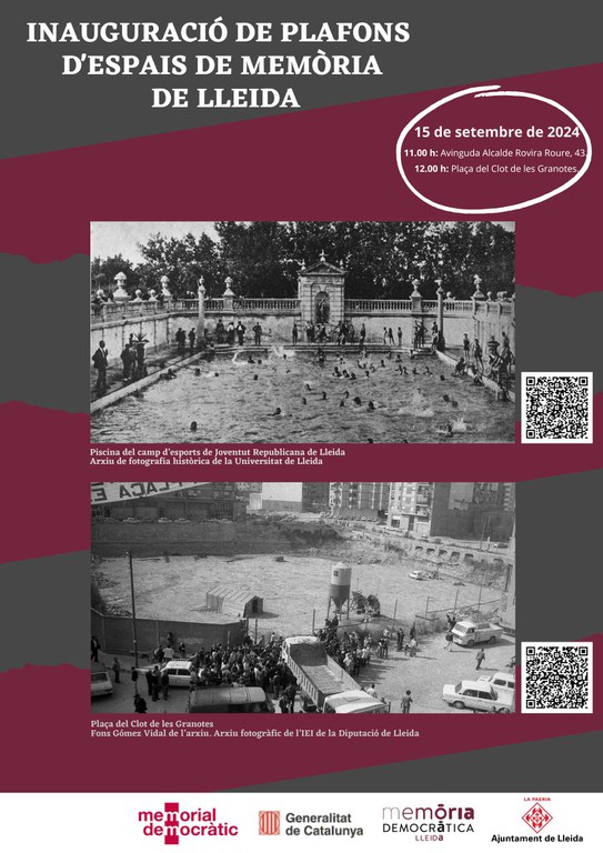 La ciudad de Lleida está llena de espacios de Memoria Democrática que transmiten el recuerdo de los diversos hechos históricos sucedidos en el período que comprende la II Republicano hasta la Transición. Algunos de estos espacios ya han sido documentados y señalizados como el Cementerio de Lleida y el Liceu Escolar entre otros. A partir del 15 de septiembre se incorporarán dos nuevos espacios. El primer lugar estará situado en la avenida Alcalde Rovira Roure que recordará el antiguo Campo de Deportes de la Juventud Republicana de Lleida. En la segunda localización de la plaza del Clot de les Granotes se hará en las luchas vecinales iniciadas en 1977 para destinar ese espacio a zona verde.