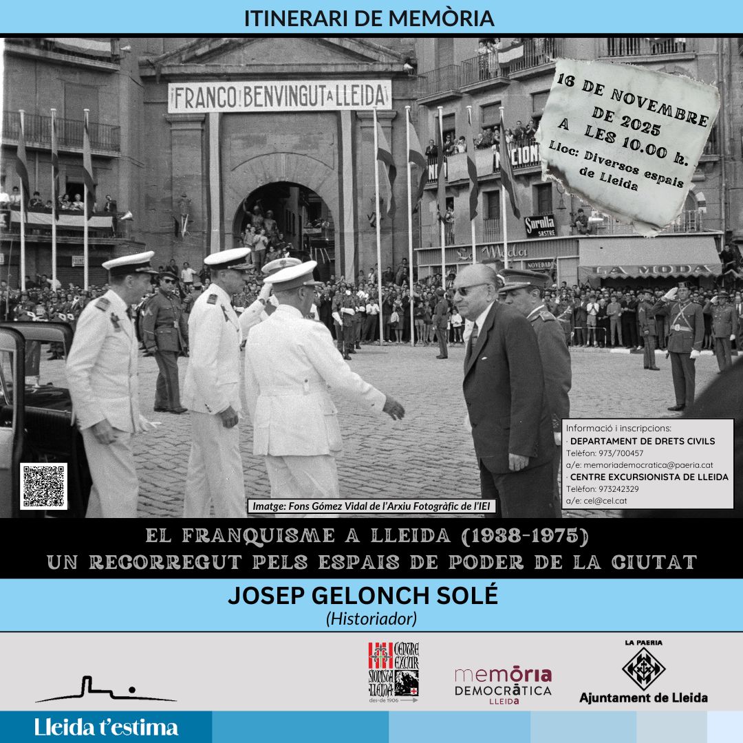 A través de un recorrido por los principales espacios de poder político del franquismo, Josep Gelonch Solé, historiador experto en el franquismo en las tierras de Lleida, nos ofrecerá una mirada crítica y documentada sobre cómo se estructuró el poder dictatorial en la ciudad, cuáles fueron sus bases sociales y políticas, y cómo se mantuvo durante casi cuatro décadas.