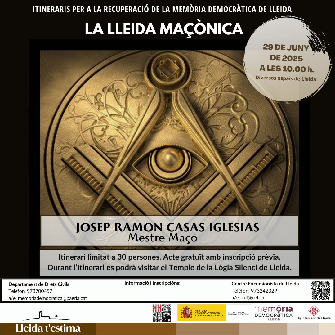 El Ayuntamiento de Lleida, a través del Área de Memoria Democrática y con la colaboración del Centro Excursionista de Lleida, organiza una ruta histórica para recuperar y reivindicar la memoria de la masonería leridana, un colectivo perseguido y silenciado durante la dictadura franquista.