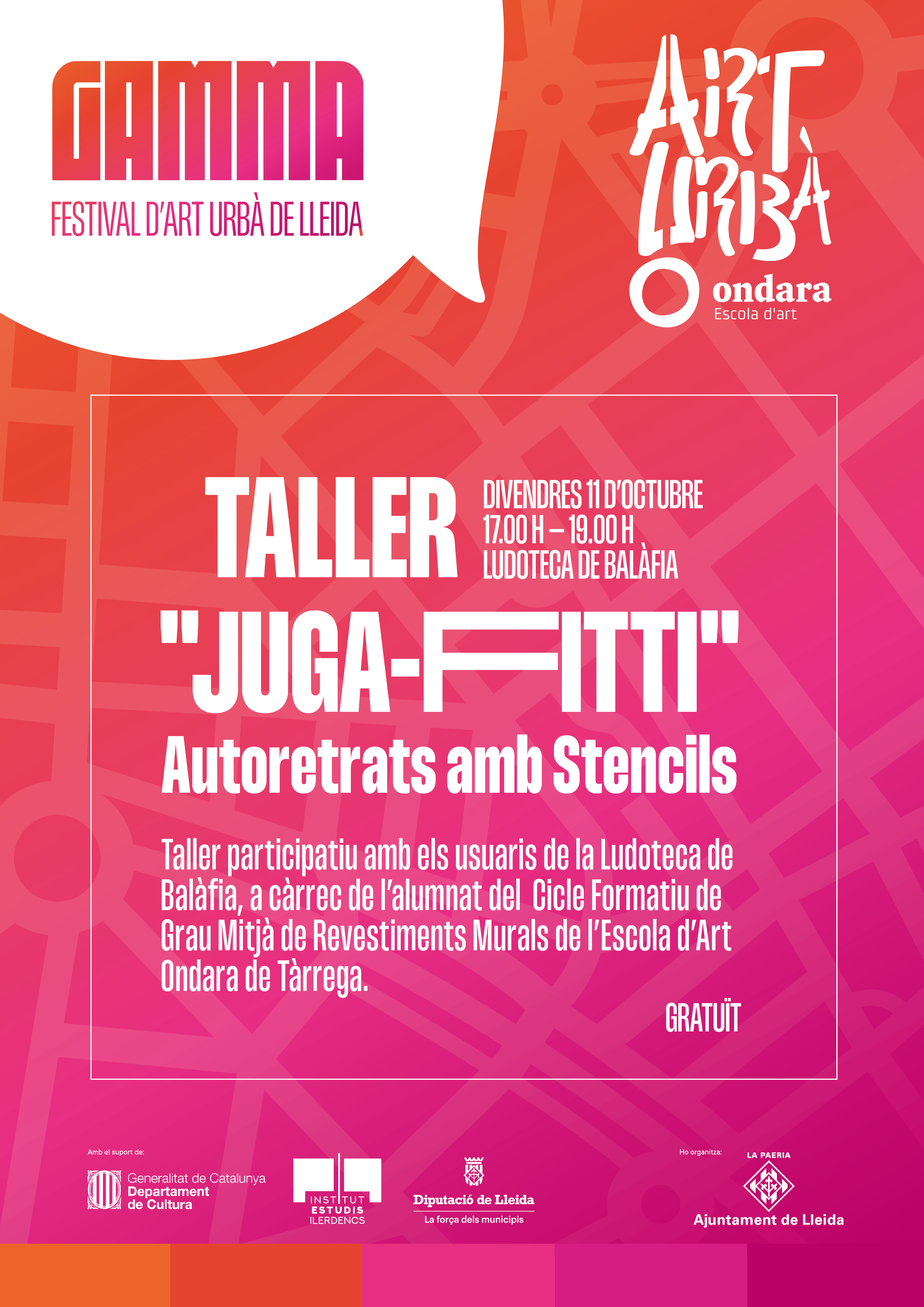 GAMMA. festival de Arte urbano de Lleida ofrece un taller participativo con los usuarios de la Ludoteca de Balàfia, los alumnos del Ciclo Formativo de Grado Medio de Revestimientos Murales de la Escuela de Arte Ondara de Tàrrega .