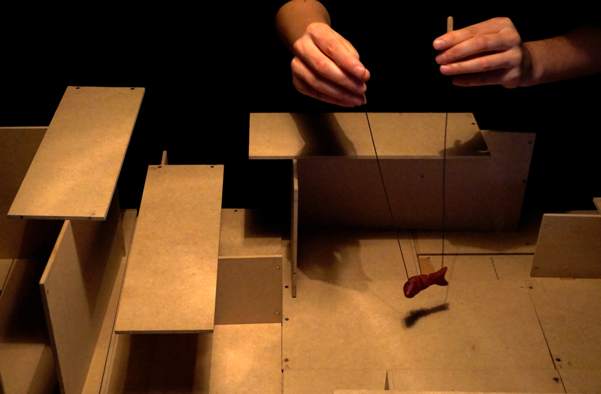 Un viaje a través de materiales como la madera, el papel, fotografías, utensilios cotidianos, dibujos... que, unidos a un ejercicio corporal de movimientos precisos, construyen un espacio pensando en constante movimiento.