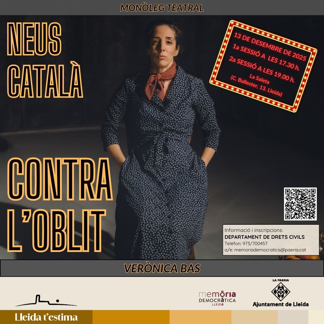 El Ayuntamiento de Lleida, en el marco de la programación de Memoria Democrática para el otoño de 2025, acogerá la representación del monólogo teatral Neus Català – Contra el olvido, interpretado por la actriz Verònica Bas y con autoría compartida con Sabine Wiedemann.