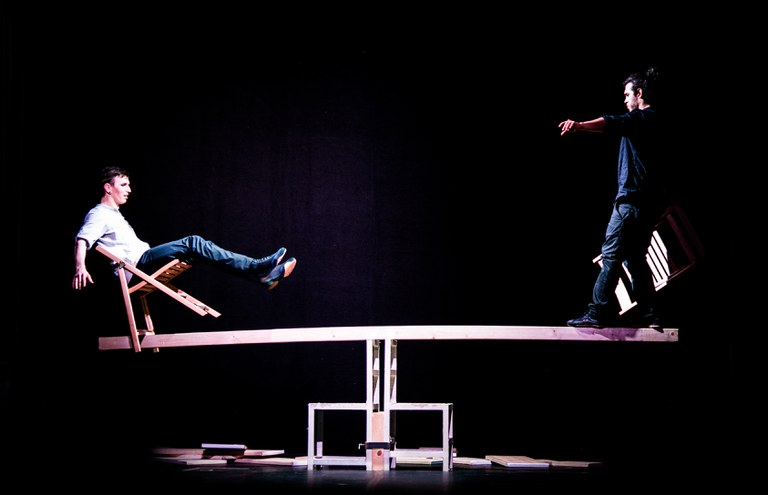 ¿Cuál es el límite extremo del equilibrio? Ese instante perfecto en el que parece desaparecer la ley de la gravedad. ¿Cuál es el límite de nuestras capacidades? A veces llegamos; otros, no. A veces le superamos; otros, no. A veces caemos; otros, no. En escena, unas piezas de madera configuran una arquitectura minimalista. Dos personajes evolucionan en busca del equilibrio. El juego es su forma de buscar ese límite. La confianza, el hilo necesario que les une y les empuja a seguir.