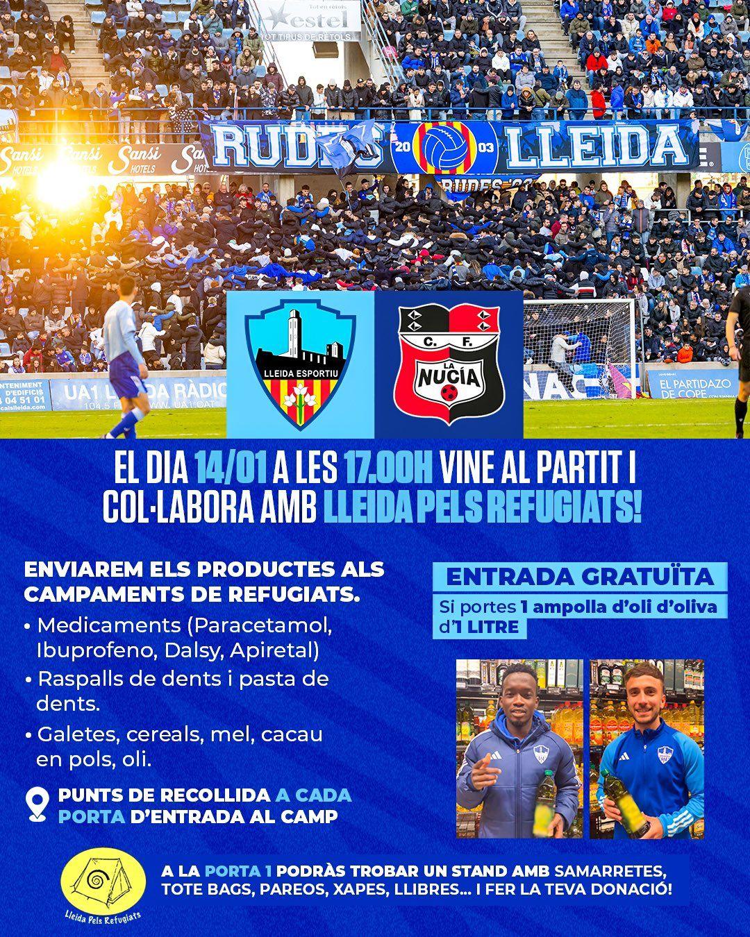 - El día 14 de enero a las 17:00h disfruta del partido entre el Lleida Esportiu y el Club de Fútbol La Nucía, y colabora con Lleida por los Refugiados con la donación de productos médicos, higiénicos y/o alimentarios. ¡Entrada gratuita llevando una botella de aceite de oliva de 1 litro! Además, en la puerta 1 encontrará un stand con camisetas, bolsas chapas y libros de la entidad Lleida para los refugiados!