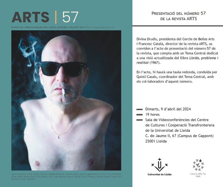 Divina Drudis, presidenta del Círculo de Bellas Artes y Francesc Català, director de la Revista ARTS, le invitan al acto de presentación del número 57 de la revista, que cuenta con un tema central dedicado a una visión actualizada del libro Lleida, problema y realidad (1967).