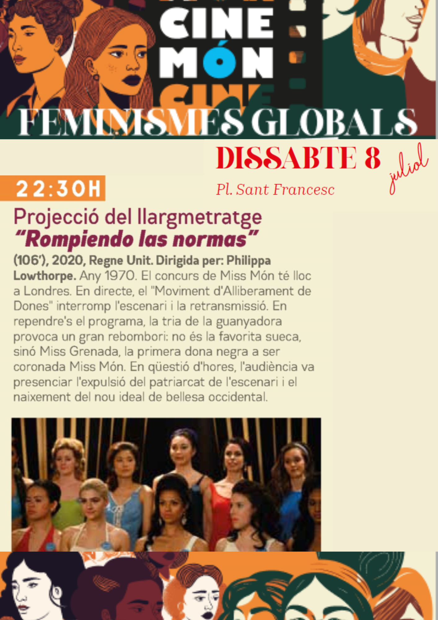 • Rompiendo las normas (106'), 2020, Reino Unido. Dirigida por: Philippa Lowthorpe. Año 1970. El certamen de Miss Mundo se celebra en Londres. En pleno directo, el "Movimiento de Liberación de Mujeres" invade el escenario e interrumpe la retransmisión. Al reanudarse el programa, la elección de la ganadora provoca una gran curva: no es la favorita sueca, sino Miss Granada, la primera mujer negra en ser coronada Miss Mundo. En cuestión de horas, la audiencia fue testigo de la expulsión del patriarcado del escenario y del nacimiento del nuevo ideal de belleza occidental. Lugar, fecha y hora: Plaza San Francisco. Sábado 8 de julio, a las 22:30h Para más información cooperacio.paeria.cat/cinemon