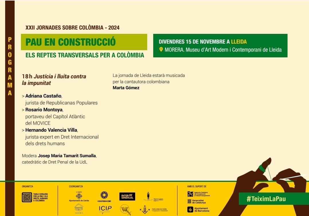 • Lleida vuelve a acoger las Jornadas de "Paz en Construcción: los retos transversales para Colombia", de la Mesa Catalana por la Paz y los DH en Colombia, en colaboración con entidades del ámbito de la justicia y el feminismo. Un acercamiento al conocimiento de aquellas acciones que se llevan a cabo en torno a la justicia y la lucha contra la impunidad, de la mano de Adriana, Rosario y Hernando. ¡Con el acompañamiento musical de Marta Gómez! Viernes 15 de noviembre a las 18h en el MORERA. Museo de Arte Moderno y Contemporáneo de Lleida (Rambla Ferran, 13)