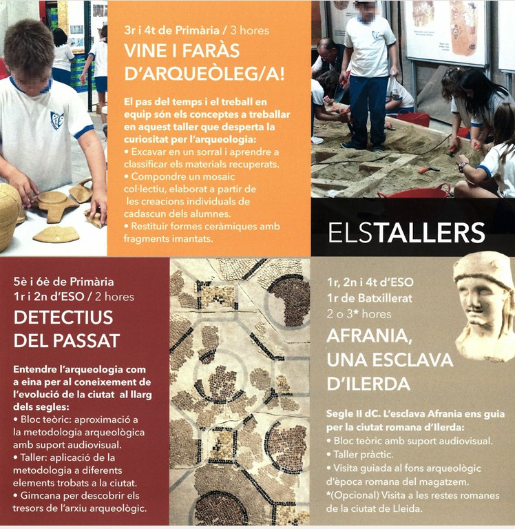 A finales de 2012, el Archivo Arqueológico se inició en esta vía de difusión con dos talleres gratuitos: “Arqueólogos, arqueólogas: Detectives del pasado” y “Afrania, una esclava de Ilerda”. Además, se empezaron a programar visitas guiadas a las curtidurías, inauguradas dos años antes. Más adelante, la oferta se amplió con el taller Ven y haz de arqueólogo/a”. En estos años, la respuesta de las escuelas y los institutos ha sido positiva, como demuestra el hecho de que muchos de los centros educativos programan anualmente los talleres.