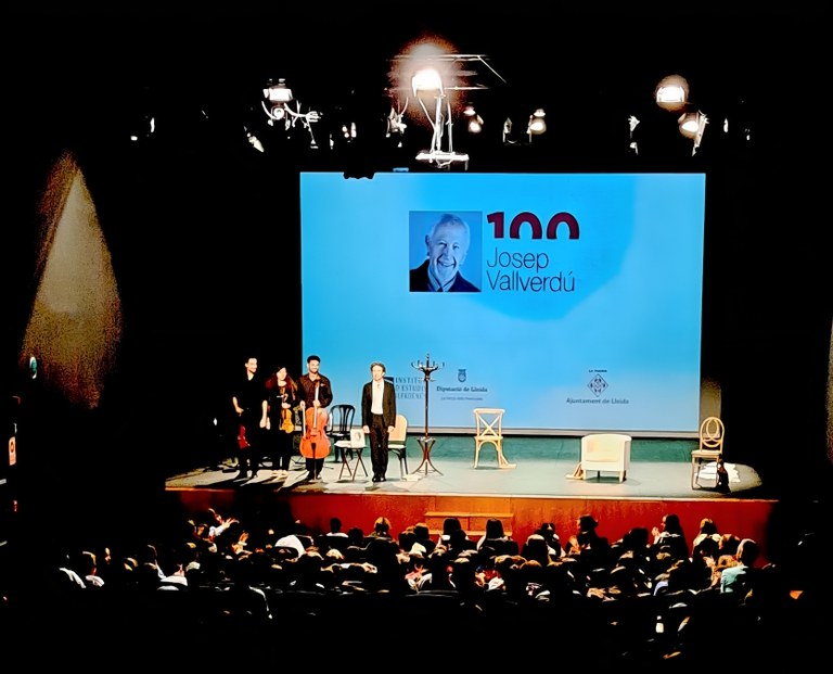 550 alumnos de 7 centros de secundaria de Lleida asistieron al espectáculo "Univers Vallverdú" en el Teatro Municipal del Matadero. Producido por el Ayuntamiento de Lleida, se llevó a cabo en el marco del Centronario de Josep Vallverdú.