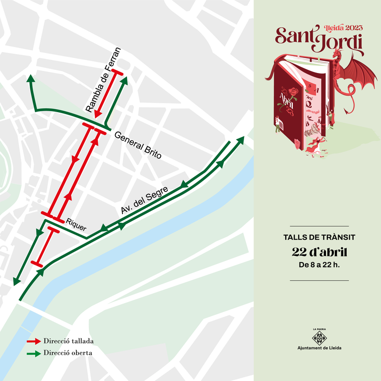 El domingo, el acceso a la zona de carga y descarga de la calle Sant Joan por Santa Marta quedará cortado al tráfico rodado. Además, no se podrá entrar ni salir en los vados de Francesc Macià ni tampoco en el vado de la Diputación de Lleida. Los libreros, floristas y otras entidades que tienen instaladas sus paradas a lo largo de Francesc Macià y Ferran han sido informados de las diversas actividades los horarios y lugares para poder realizar la carga y descarga de los materiales, dado que no se permite el acceso con vehículos en la Rambla central. Los veladores autorizados en el tramo de Francesc Macià se podrán colocar en la calzada.