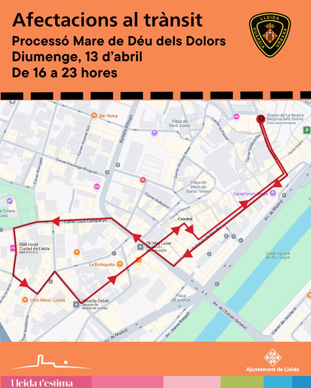 La Guardia Urbana velará por el buen funcionamiento del tráfico durante la Procesión de la Virgen de los Dolores, que tendrá lugar este domingo por la tarde-noche en Lleida. El itinerario de la procesión se iniciará en la calle Cavallers y seguirá por la avenida de Blondel, avenida de Catalunya, calle Lluís Companys, calle Unió, calle Templers, calle Academia, calle República Paraguay, calle Alcalde Costa, avenida de Catalunya, calle Sant Antoni, plaza de la Catedral, calle Major, calle Vila de Foix, calle Vila de Foix.