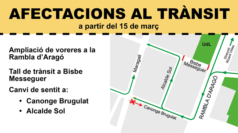 El tramo inicial de la calle quedará cortado y se cambiará de sentido provisionalmente un tramo de Canonge Brugulat y Alcalde Sol para permitir el acceso a Bisbe Messeguer