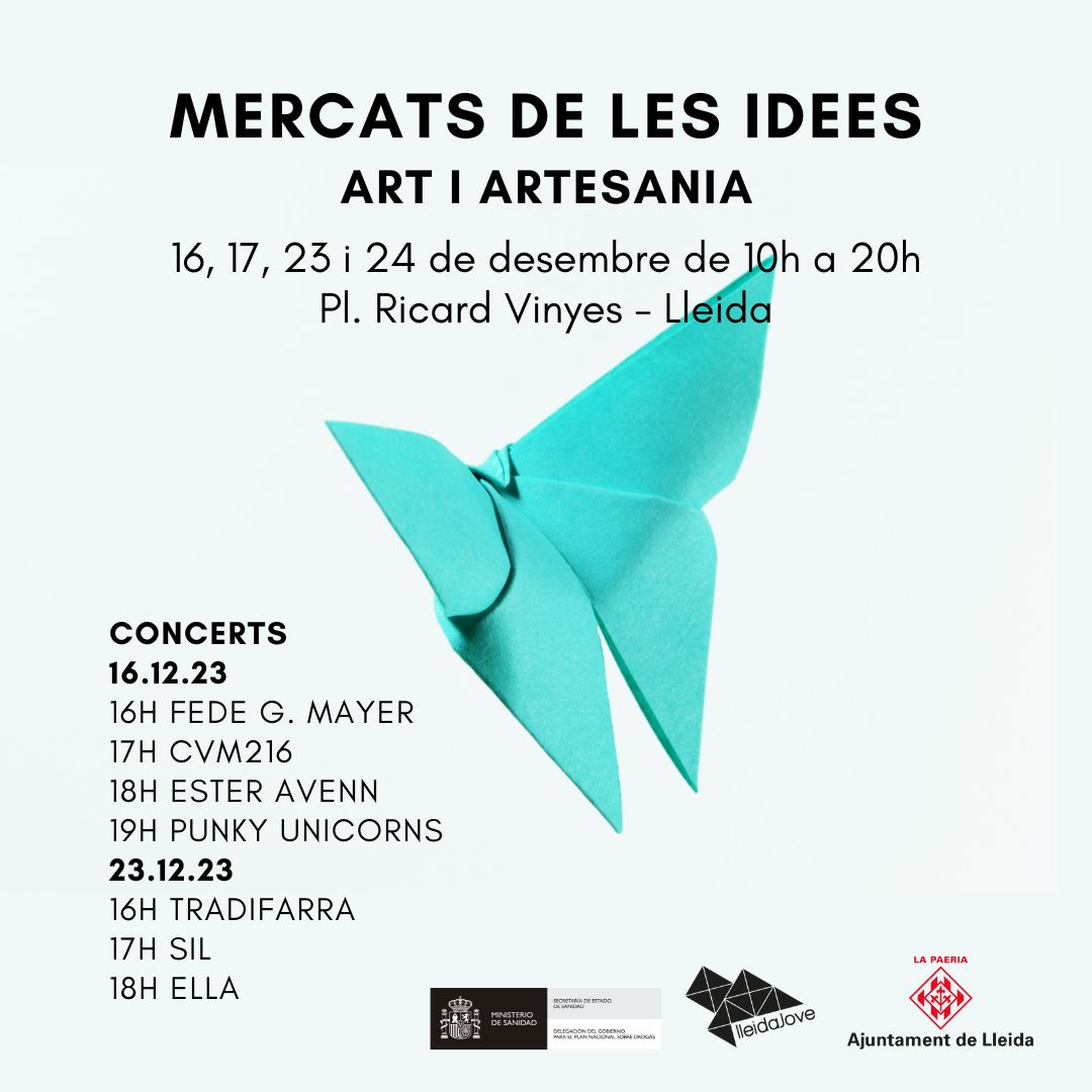 La Concejalía de Juventud, Educación y Empleo organiza el Mercado de las Ideas que tendrá lugar los días 16, 17, 23 y 24 de diciembre, en la plaza Ricard Viñes. Participarán 32 artistas y artesanos jóvenes que pondrán a la venta sus creaciones de diferentes especialidades: bisutería, joyería, ilustración, ropa, ganchillo, fanzines, pintura, madera, cerámica, velas y complementos.