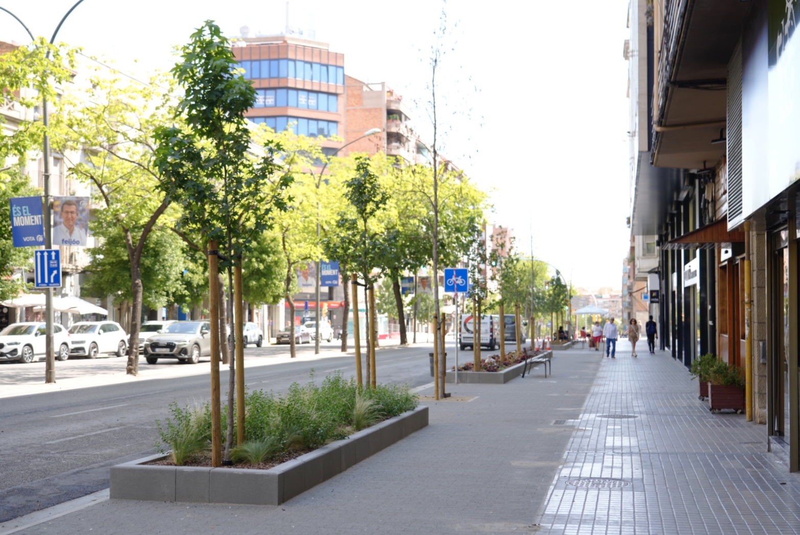 El tramo del proyecto realizado hasta ahora, financiado por los fondos europeos #NextGenerationEU, ha comportado la ampliación de la acera de la banda del centro Histórico, pasando de 3'60 a 6'30 metros. Se calcula que pasan, a diario, entre 4.000 y 6.000 personas. Se ha facilitado la circulación de peatones con nuevos pasos semaforizados en los cruces con Salmerón, Pi y Margall o Príncipe de Viana. Se ha implantado carril bici, para dar un espacio seguro para bicicletas y patinetes. Y se ha plantado nuevo arbolado y habilidad jardineras y nuevos bancos.