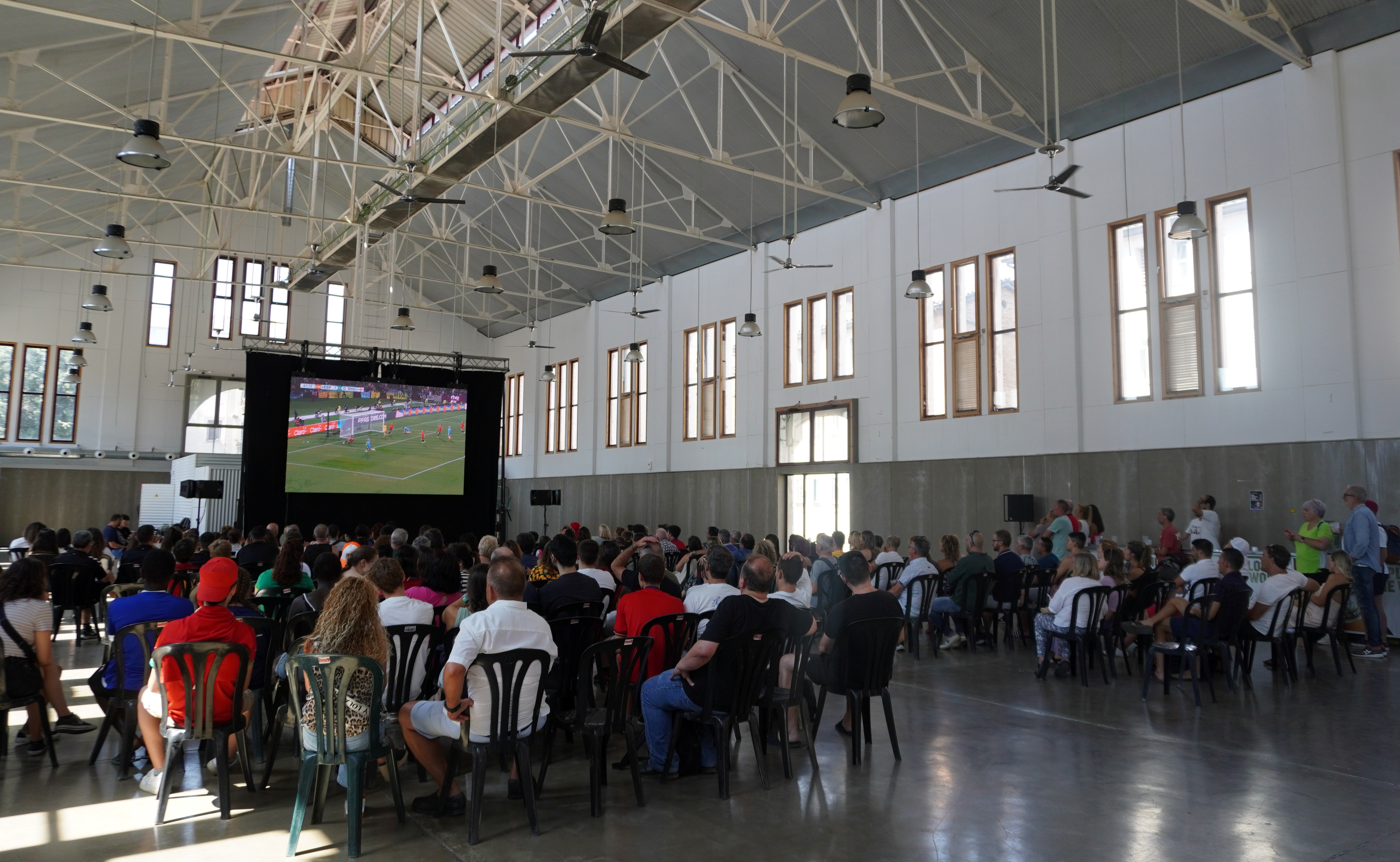 Pantalla gigante en el Mercat del Pla instalada por la Paeria para seguir la final del Mundial de fútbol femenino..