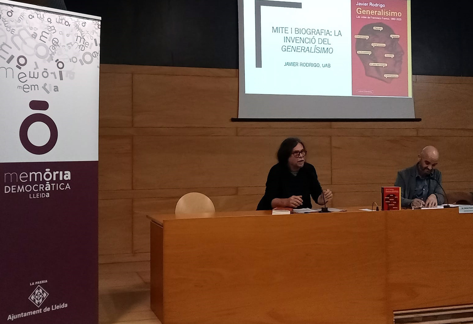 La Paeria ha organizado una nueva edición de Debates de Memoria que, en esta ocasión, ha girado en torno a la invención de la biografía del Generalísimo. Con el título “Mito y biografía: la invención del Generalísimo”, el catedrático e investigador, el Dr. Javier Rodrigo Sánchez, ha dado una charla en la que ha hablado de los mecanismos de construcción de los distintos mitos que rodearon la figura de Franco. Desde un análisis a partir de sus distintos nombres (Caudillo, Comandantín, etc.), Rodrigo ha analizado la invención de la biografía de Franco y cómo su vida se convirtió por parte de sus propagandistas y biógrafos, y también de muchos otros medios, en una historia de predestinación y providencialismo: en la historia del Generalísimo. El acto de esta tarde se ha realizado en la sala Jaume Magre.