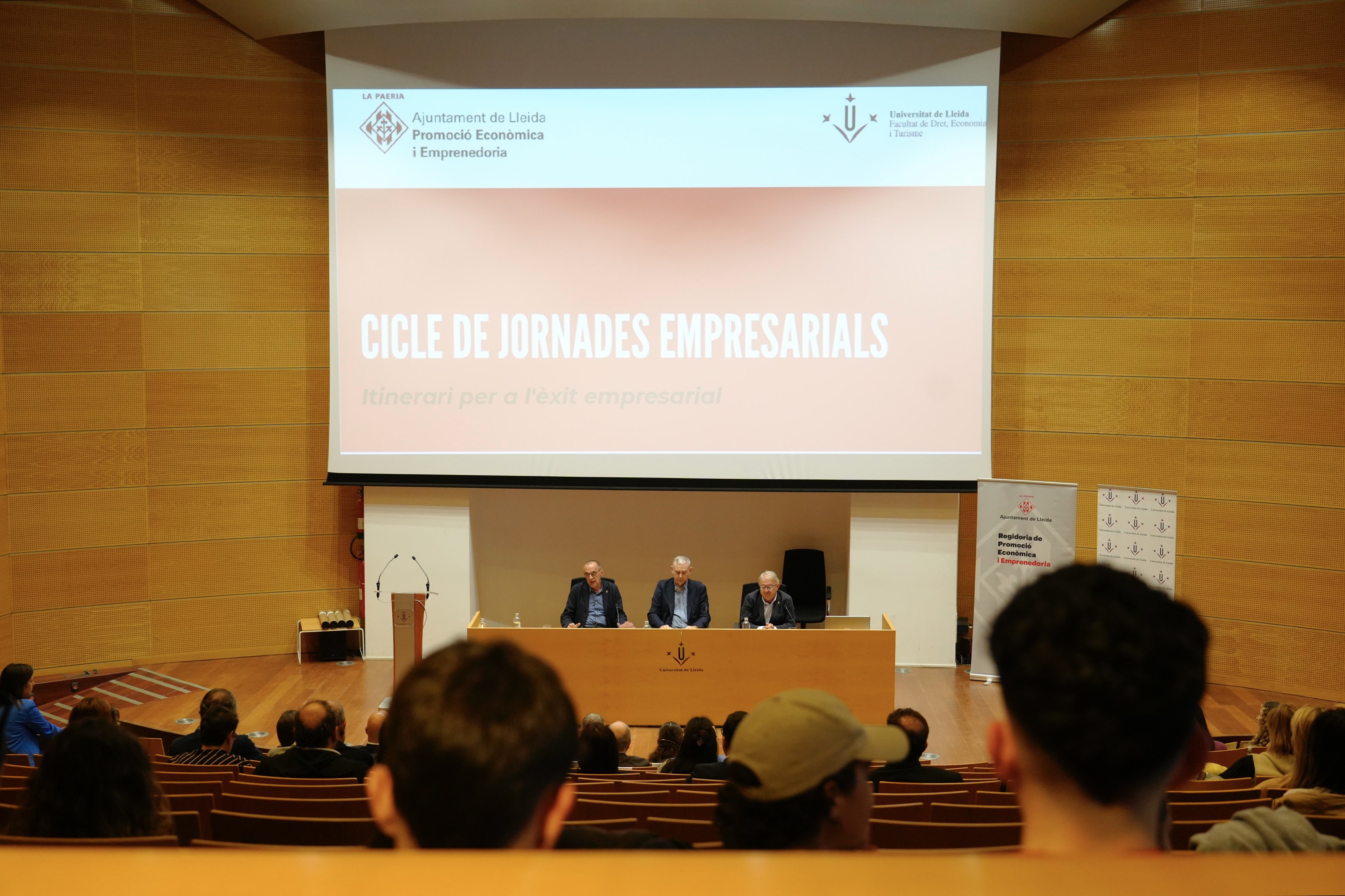 El alcalde de Lleida, Miquel Pueyo, acompañado del teniente de alcalde, Paco Cerdà, y del decano de la Facultad de Derecho, Economía y Turismo, Eduard Cristòbal, ha asistido a la quinta jornada empresarial que organiza la Concejalía de Promoción Económica de el Ayuntamiento de Lleida.