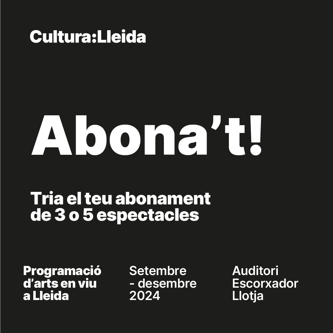 Esta temporada continúan los descuentos conjuntos de Artes Escénicas y música, así como los abonos iniciados durante la anterior campaña con la que se pretende, además de la fidelización del público, que también puedan conseguir el mejor precio con la máxima flexibilidad. Así, encontramos el Abono 3 (hasta un 20% de descuento eligiendo 3 funciones o conciertos) y el Abono 5 (hasta un 25% de descuento eligiendo 5 funciones o conciertos). Estos abonos incluyen las entradas de toda la programación de artes escénicas y música de otoño 2024 y son unipersonales. Además, se seguirá aplicando un 50% de descuento al alumnado de estudios de música, teatro y danza de la ciudad menores de 20 años. Para poder aplicarse este descuento es necesario registrarse realizando un trámite online en la web del Ayuntamiento de Lleida.