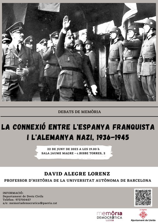 El Ayuntamiento de Lleida ha preparado un nuevo Debate de Memoria para mañana jueves, día 22, que tiene como título "La conexión entre la España franquista y la Alemania nazi, 1936-1945". Se ha hecho coincidir con esta fecha dado que el 22 de junio se conmemora el aniversario del inicio de la invasión alemana de la URSS en la llamada “Operación Barbarroja”. Este 2023 es el 82 aniversario. A las pocas semanas, se añadieron miles de voluntarios españoles integrados en la División Azul. Era un paso más en las estrechas relaciones entre ambos regímenes dictatoriales.