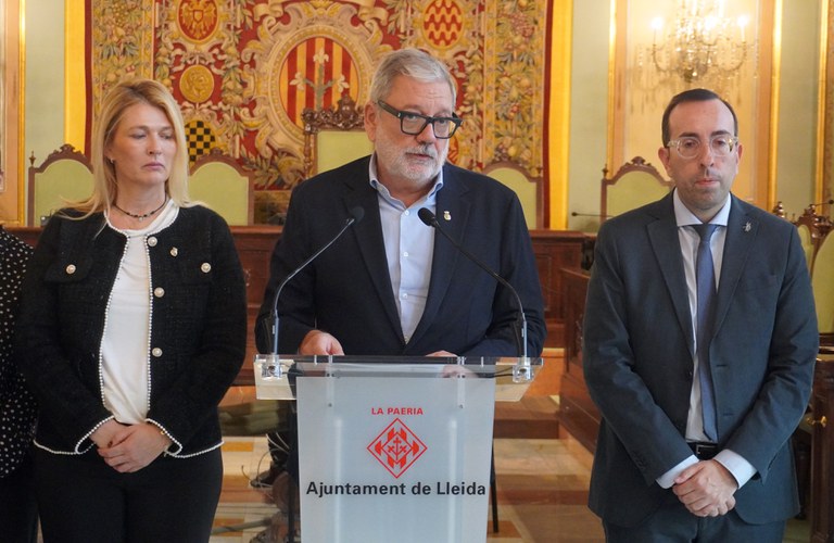 El paer en cap, Fèlix Larrosa, ha leído este jueves la declaración institucional del Ayuntamiento de Lleida en solidaridad con las víctimas y los municipios afectados por la DANA, en el acto que se celebró este jueves en el Salón de Sesiones. El alcalde, acompañado de los miembros de la Corporación Municipal, de representantes de los cuerpos de seguridad y de entidades de la ciudad, ha trasladado en nombre de la ciudad y de la Paeria el pésame a las familias de las víctimas por el temporal DANA, así como todo el soporte y acompañamiento a las personas afectadas.