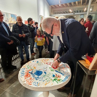 El alcalde, Fèlix Larrosa, ha asistido a la celebración del 20 aniversario de la Galería Espai Cavallers, que ha tenido lugar en el mismo espacio y ha contado con diversos eventos especiales para festejar esta fecha: un pastel de cumpleaños que los y las asistentes han podido completar a partir de dos mangas de pastelería cargadas de crema que han puesto a prueba su creatividad, un vídeo que ha recogido el vínculo de veinte artistas vinculados a la galería y para cerrar el acto, la música de Kelly Isaiah.
