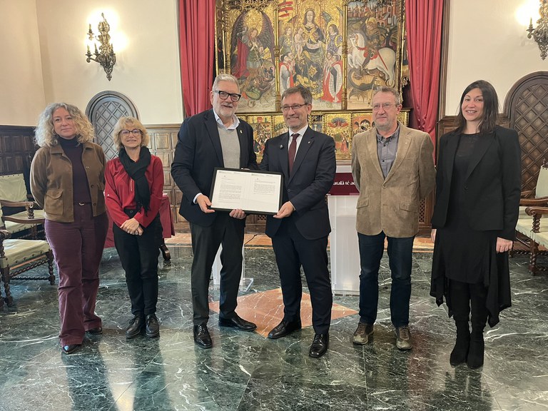 El paer jefe encabeza la recepción institucional al consejero de Política Lingüística en el Palacio de la Paeria y le entrega el decreto de adhesión de Lleida al Pacto Nacional por la Lengua