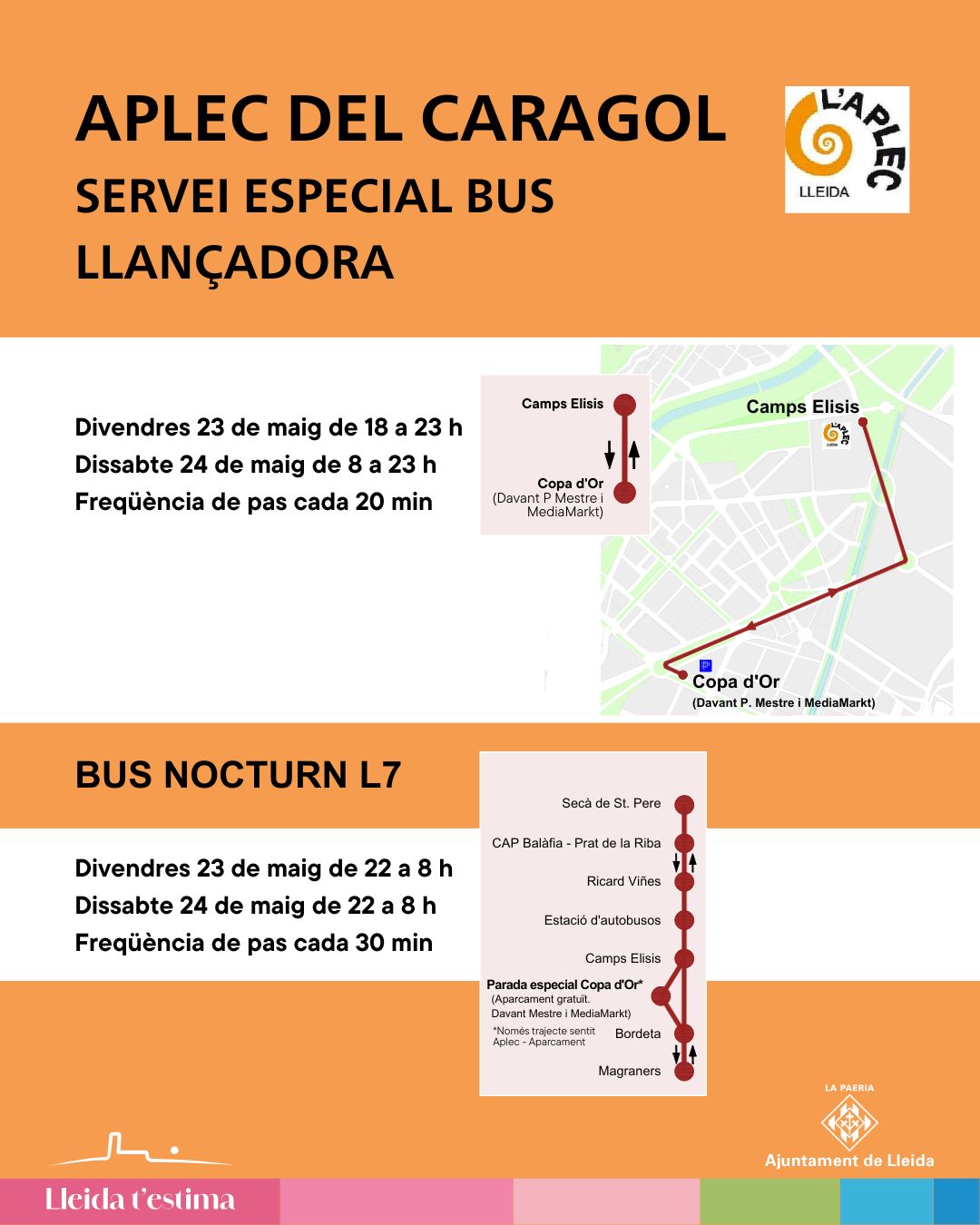 Para garantizar un regreso a casa con seguridad, la Paeria habilita, de nuevo, de forma gratuita el autobús nocturno de la L-7, con paradas a demanda y agentes informadores. Funcionará de las 22 ha las 8 h de la mañana (sólo trayecto sentido Aplec-aparcament), con una frecuencia de paso aproximada de 30 minutos.
