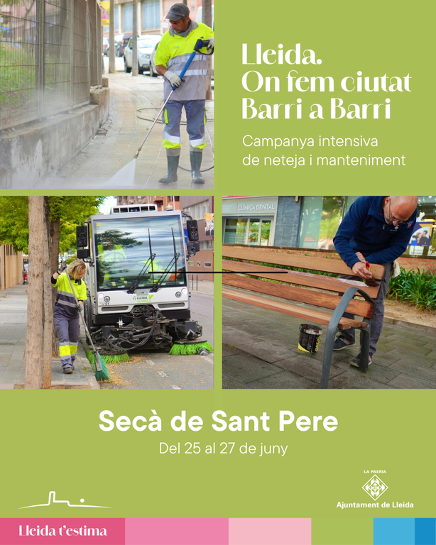 La actuación intensiva de limpieza, desbroce y mantenimiento del Barri a Barri se desplaza esta semana, del miércoles 25/06 al viernes 27/06, en el barrio del Secà de Sant Pere. Los operarios de las brigadas municipales y las empresas concesionarias llevarán a cabo diferentes tareas, como la instalación de un nuevo banco en la calle la Creu, la reparación del pavimento de la plaza Sant Pere y la limpieza a fondo de las zonas de juegos infantiles de las plazas Rioja, Emili Subies y Francesc Solana, parques y jardines, aceras y mobiliario urbano.