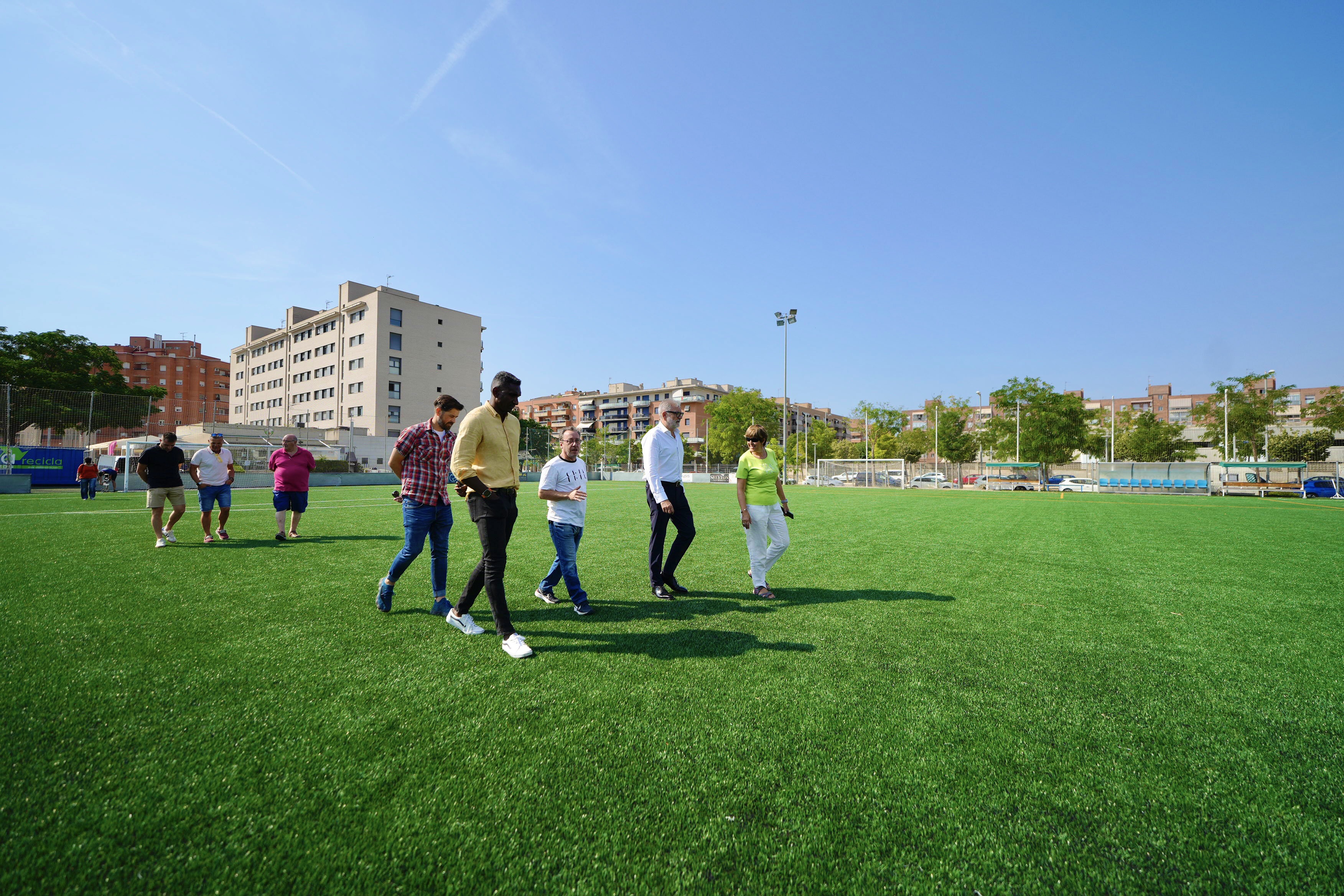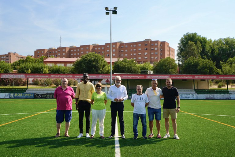 El alcalde de Lleida, Fèlix Larrosa, acompañado del concejal de Deportes, Jackson Quiñónez, junto con el presidente de la UE Balàfia, Francisco Rodríguez, y la presidenta de la Asociación de Vecinos de Balàfia, Jos Farreny, han visitado este miércoles el campo de fútbol municipal Manuel Lorite una vez terminados los trabajos de renovación del césped artificial de ambos campos.