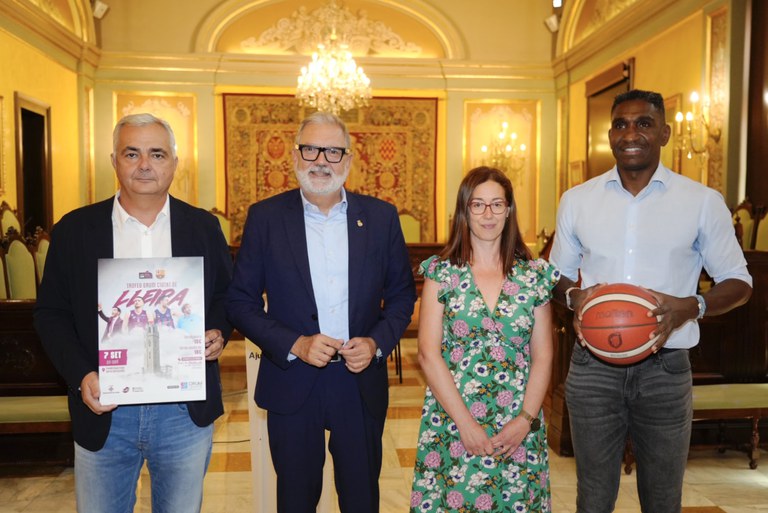 El alcalde de Lleida, Fèlix Larrosa, y el concejal de deportes, Jackson Quiñonez, acompañados del presidente del Força Lleida, Albert Aliaga, y de la jefa de gestión y atención al usuario de Orum, Rosa Fondevila, han presentado la edición 2023 del Trofeo Orum Ciudad de Lleida que se disputará el próximo día 7 de septiembre, a las 20.30 horas, en el pabellón municipal Barris Nord, con el partido entre el ICG Força Lleida y el Barça de Roger Grimau.