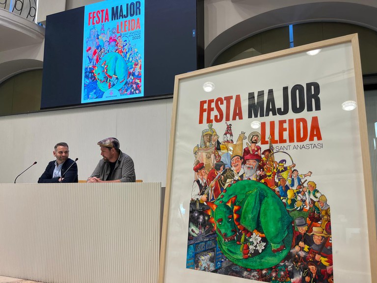 El concejal de Fiestas y Tradiciones, Xavi Blanco, presentó hoy el cartel de la Fiesta Mayor de Lleida, que se celebrará del 9 al 12 de mayo, y avanzó algunos detalles de la fiesta más participativa y esperada en la ciudad. Le ha acompañado el autor del cartel, el ilustrador Oriol Caminal, quien ha explicado que la imagen representa la gran variedad de actos que se puede realizar en un día de Fiesta Mayor, con especial atención a los elementos de cultura popular y al Marraco.