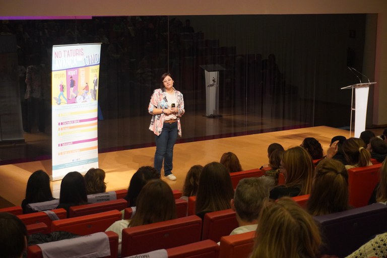 El Teatro de La Llotja se ha llenado esta mañana de alumnado de varios centros de secundaria para escuchar al monólogo Eso no es amor , a cargo de Marina Marroquí. La actividad, que forma parte de los actos programados con motivo del Día Internacional por en la Eliminación de la Violencia contra las Mujeres, tiene por objetivo sensibilizar, especialmente al público juvenil, sobre las violencias que afectan a las mujeres. Guivernau, Jefa de Área de Capacitación Profesional y Empleo del Instituto Municipal de Empleo Salvador Seguí, y la teniente de alcalde y concejala de Políticas Feministas, Carme Valls, han presentado el acto, que ha contado con la asistencia del concejal de Juventud, Educación y Empleo, Xavi Blanco, y el concejal David Melé.