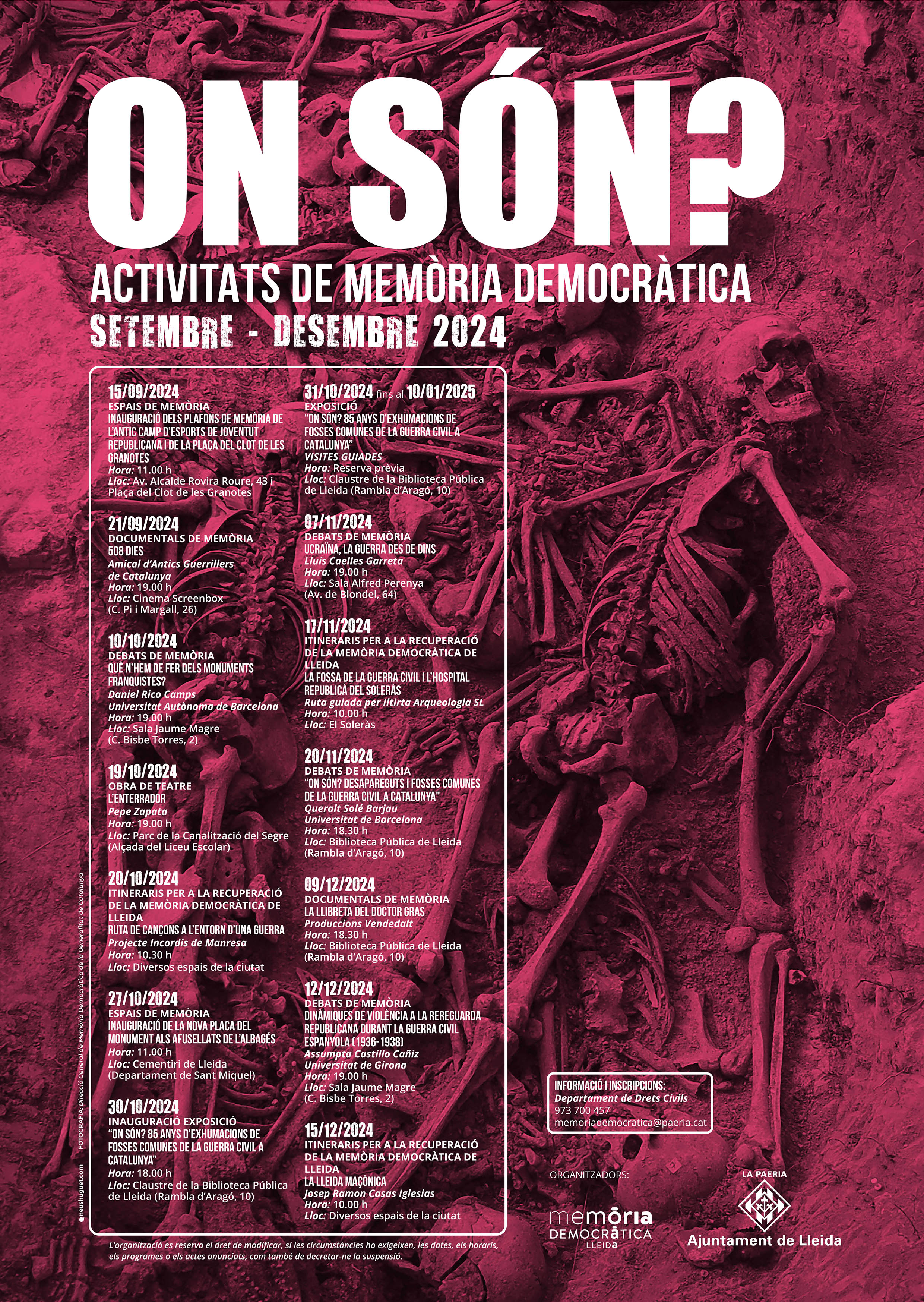La Paeria ha coordinado catorce propuestas hasta diciembre, con debates de memoria, itinerarios, documentales, etc. que giran en torno a la exposición “¿Dónde están?” que muestra el trabajo que se está haciendo respecto a las fosas comunes de la Guerra Civil y el franquismo en Cataluña y que se instalará del 30 de octubre al 10 de enero en la Biblioteca Pública de Lleida