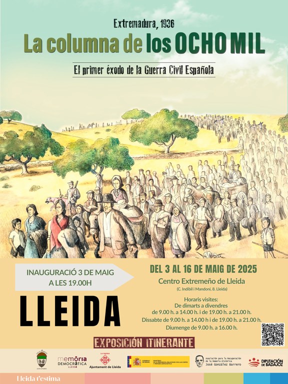 El área de Memoria Democrática de la Paeria relatará el primer éxodo de la Guerra Civil con dos actividades, en forma de exposición y documental, que llevan por título “La columna de los 8.000”. La muestra narra los hechos que sucedieron en Extremadura en septiembre de 1936, con textos y fotografías y la recopilación de testimonios de familiares de las personas que vivieron este exilio. "La columna de los 8.000" se podrá visitar del 3 al 16 de mago en el Centro Extremeño de Lleida (c/ Indíbil y Mandoni, 8). La exposición, itinerante, pretende fomentar la investigación y obtener testimonios en la lucha por la dignificación de las víctimas. La Paeria ha traído a Lleida la exposición, que está organizada por el Ministerio de Política Territorial y Memoria Democrática, la Asociación para la Recuperación de la Memoria Histórica José González Barrero y la Diputación de Badajoz.
