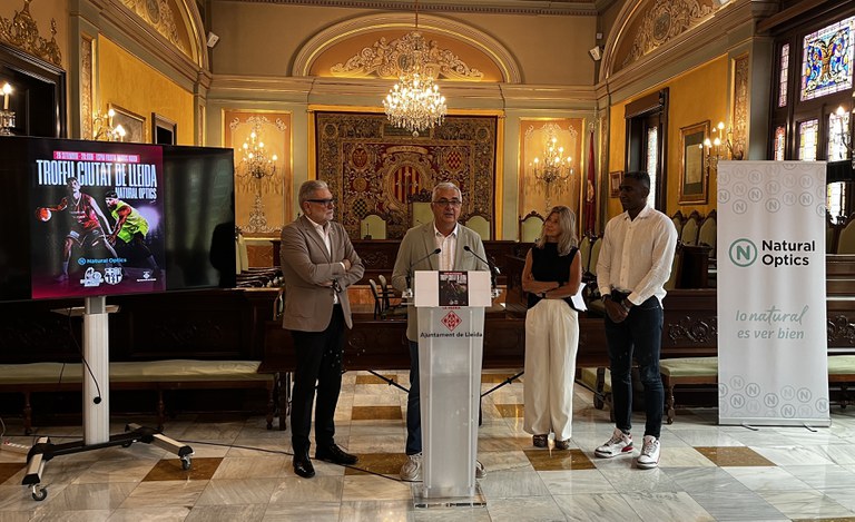 El pabellón Barris Nord acogerá el viernes 26 de septiembre el Trofeo Ciudad de Lleida Natural Optics que jugarán el Hiopos Lleida y el FC Barcelona. Ésta será la primera edición que el conjunto leridano disputa el trofeo como equipo de ACB y, por tanto, se espera que el partido genere ilusión y expectación en el pabellón municipal, ya que también será el partido de presentación del equipo ante su afición. El paer en cap, Fèlix Larrosa, acompañado del presidente del Força Lleida, Albert Aliaga, y de Montse Solé, en representación de Natural Optics, han presentado en la Paeria la nueva edición del Trofeo, que este año se enmarca en el programa de las Festes de la Tardor (de Otoño) de la ciudad y que ya tiene las entradas a la venta.