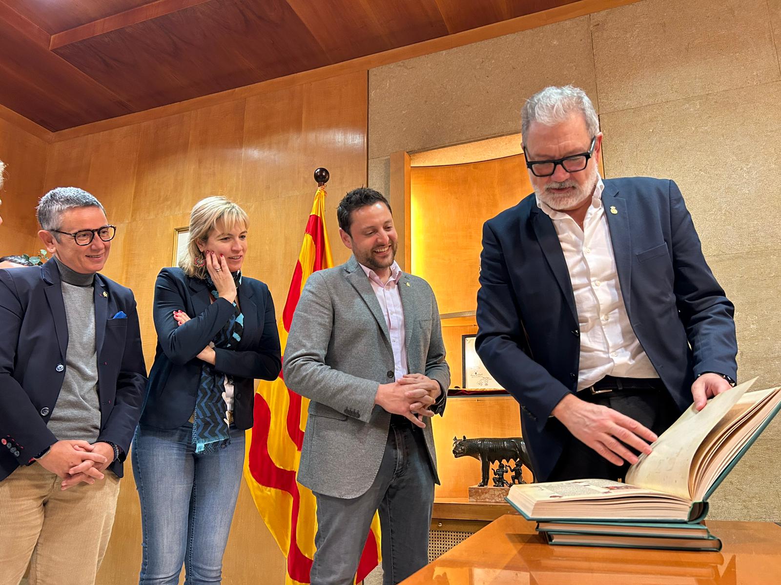 El alcalde de Lleida, Fèlix Larrosa, ha realizado este lunes una visita institucional al Ayuntamiento de Tarragona donde ha sido recibido por su alcalde, Rubén Viñuales, acompañado de los consejeros y consejeras del equipo de gobierno y los portavoces de los grupos municipales presentes en el consistorio. El alcalde ha firmado en el Libro de Honor del Ayuntamiento de Tarragona.