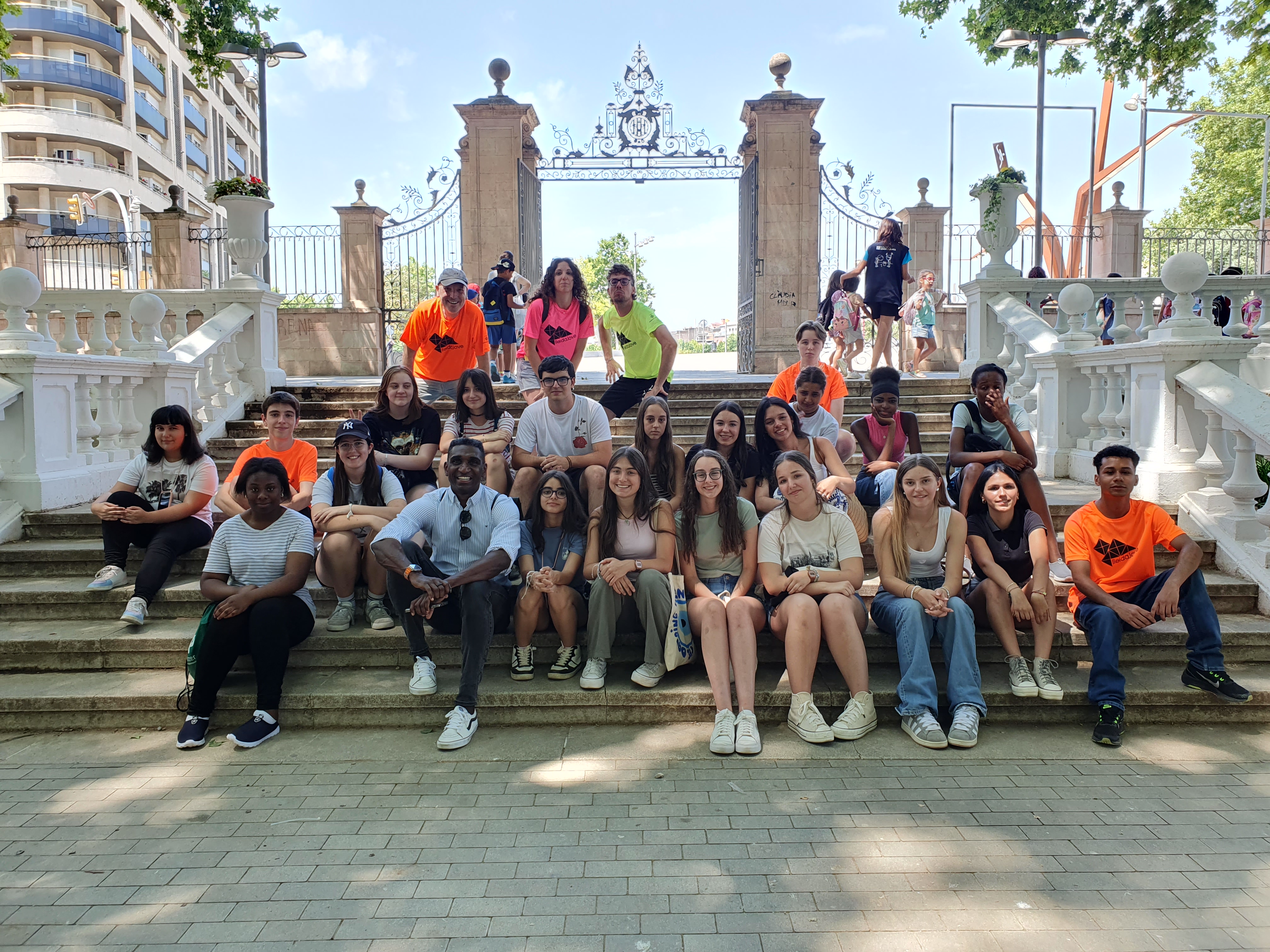 Una vez terminada la actividad, los niños de Estiu de Joc se han sentado en las escaleras de la puerta principal de los Campos Elíseos con los Premonitores y han presentado un saludo que han preparado para el equipo técnico de la concejala responsable de la actividad.