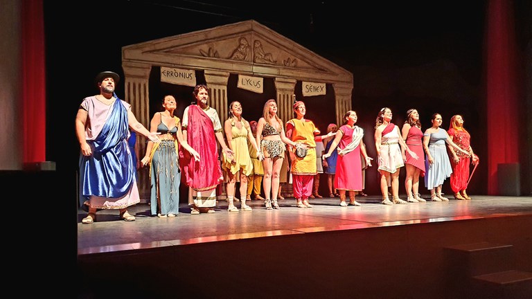 La 31ª Muestra de Artes Escénicas Josep Fonollosa “Fono” ha presentado esta noche la penúltima propuesta de la edición de este año: “Disparates a la romana” de Magraners en Escena. La obra, dirigida por el director y actor leridano Ramon Molins a partir de comedias clásicas de Plauto, es una comedia musical que centra la acción en Roma, donde Pseudolus, un esclavo romano, hará cualquier cosa para ganar su libertad. En el espectáculo han participado 24 actores y actrices.